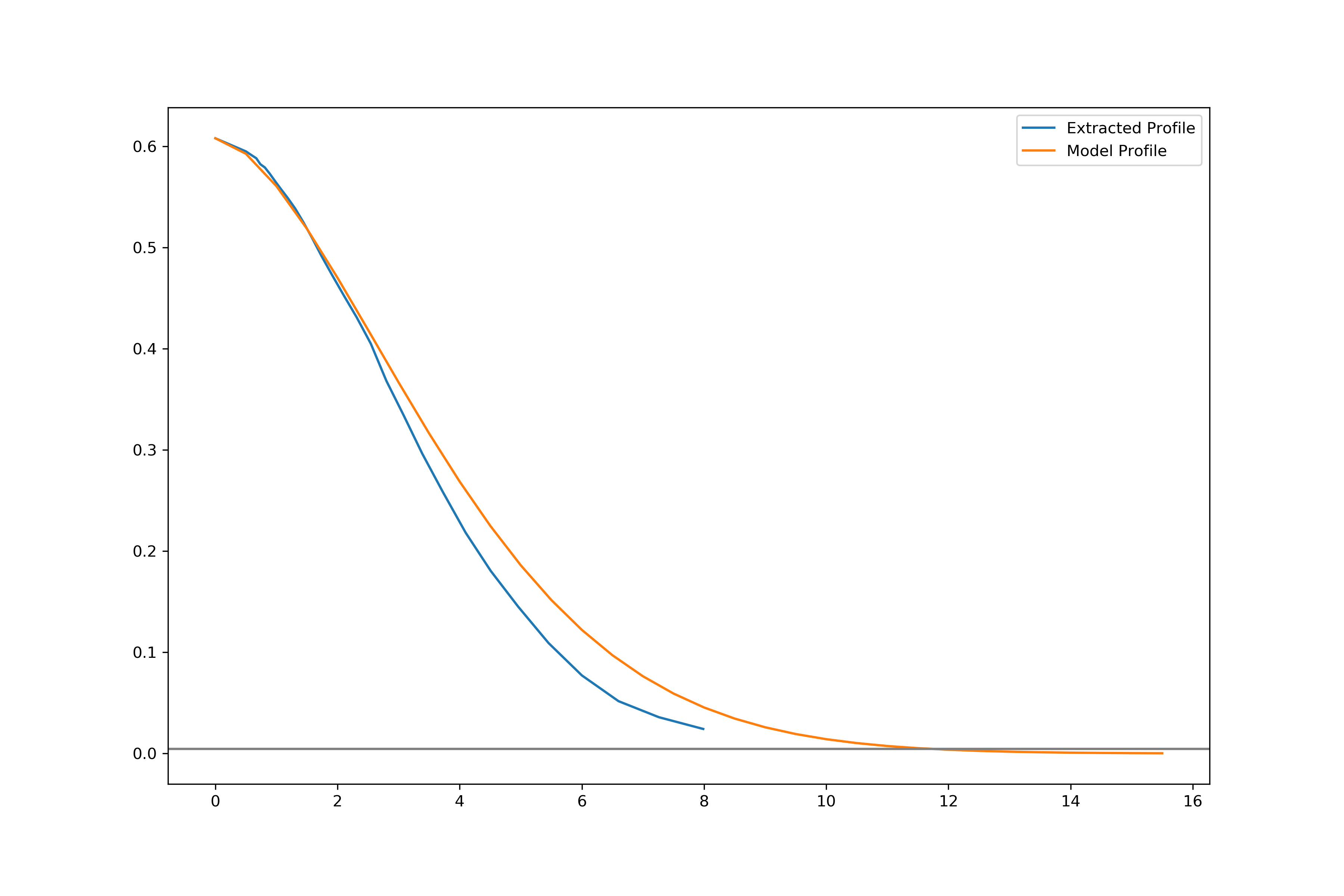 So by default, this parameter is set to None. If we set it to whatever value we like (say, the largest distance horizontally or vertically from the center to the cutout edge), we should be able to extend the profile even further. This will essentially be forcing the extraction as far as it can go.