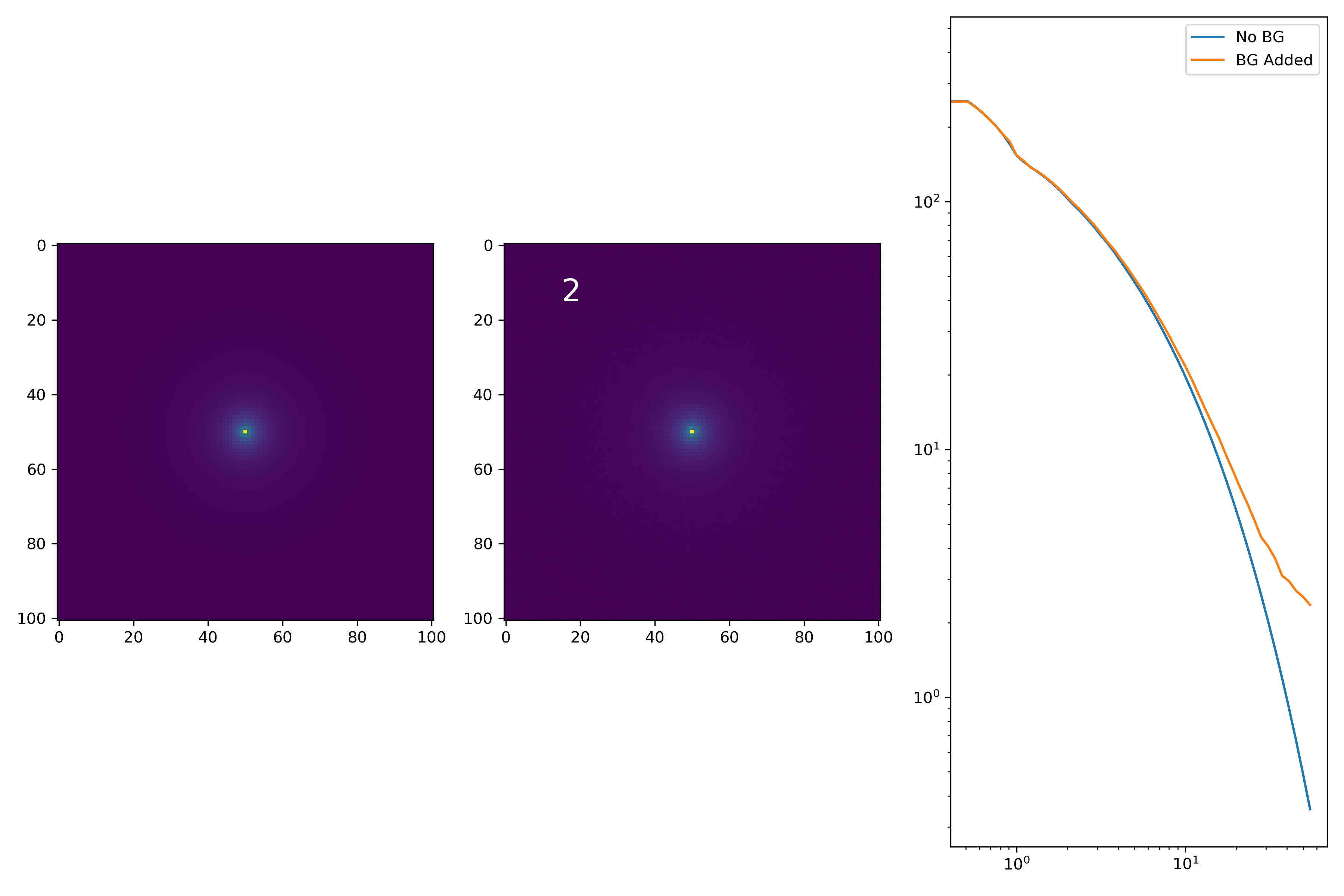 Interesting results! As you can see, there are two noticeable effects. The first is that the profile is “peeled up” if the background is somewhat bright. However, since I’ve logged the yscale, if it enters a region of I(r) <= 0, if drops down heavily. One it hits those the profile starts to get a little crazy looking.